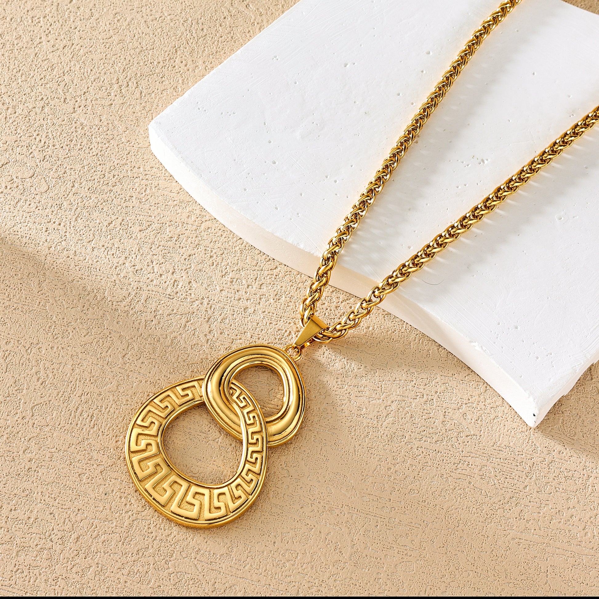 Make a bold statement with our heavyweight gold link chain necklace. The pendant features two interlocking circles adorned with intricate Greek key (meander) patterns, offering a timeless, yet modern look. Ideal for those who love architectural jewelry with symbolic meaning.